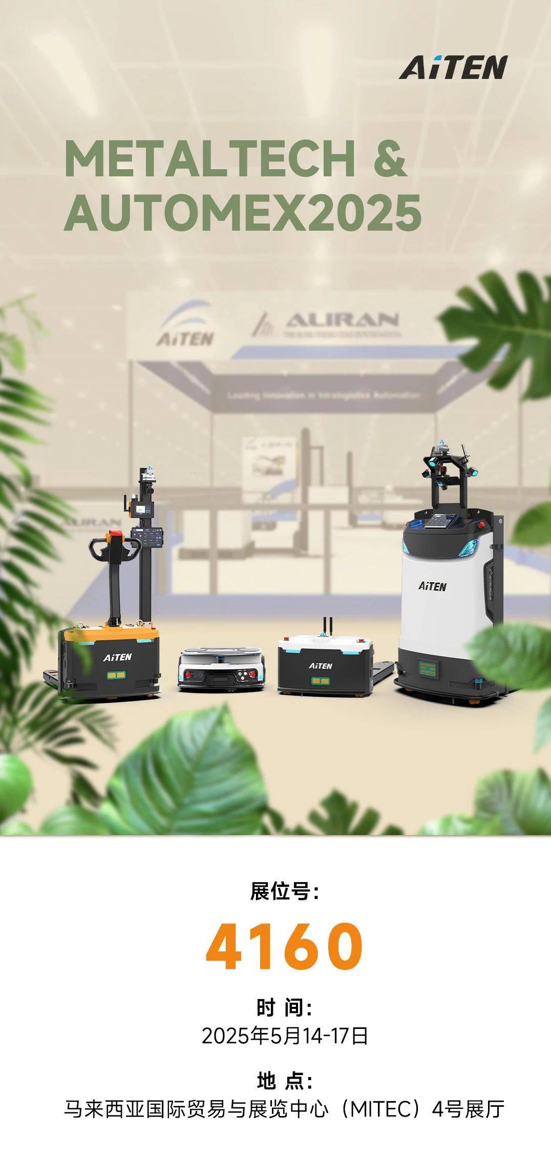 倒计时启动!诚邀您参与现场动态演示,JIUYOU九游AiTEN将携搬运移动机器人AM15,MP10,APE15,TT15惊艳亮相(2025.5.14-17)。